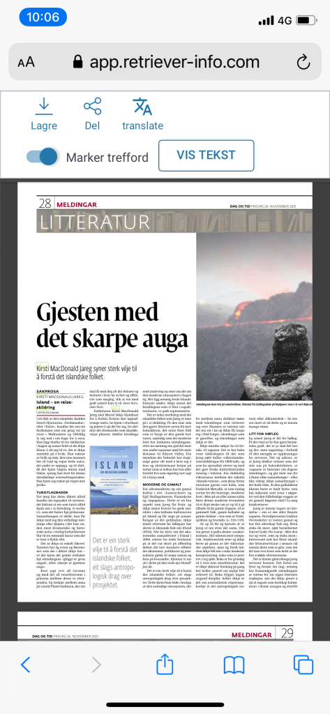 Jeg ble så glad og takknemlig over denne anmeldelsen i Dag og Tid av Bergsveinn Birgisson den 26.november. Den omhandler min nyeste reiseskildring som kom ut på Cappelen Damm våren 2021.