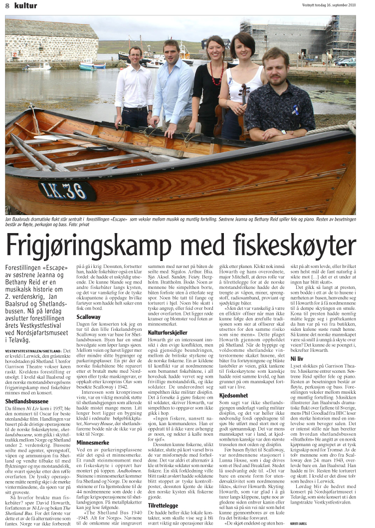 Her er en artikkel jeg skrev for avisen «Vestnytt» om Shetlandsgjengen og den svært gripende forestillingen «Escape» som har blitt oppført i både Skottland og Norge. Den omhandler flukten til Jan Baalsrud og hedrer minnet til alle som døde under de farlige operasjonene som går under navnet «the Shetlandbus». Shetlandgjengen lever sterkt i minnet hos shetlenderne, noe denne forestilligen vitner om. CD fra forestillingen kan kjøpes.